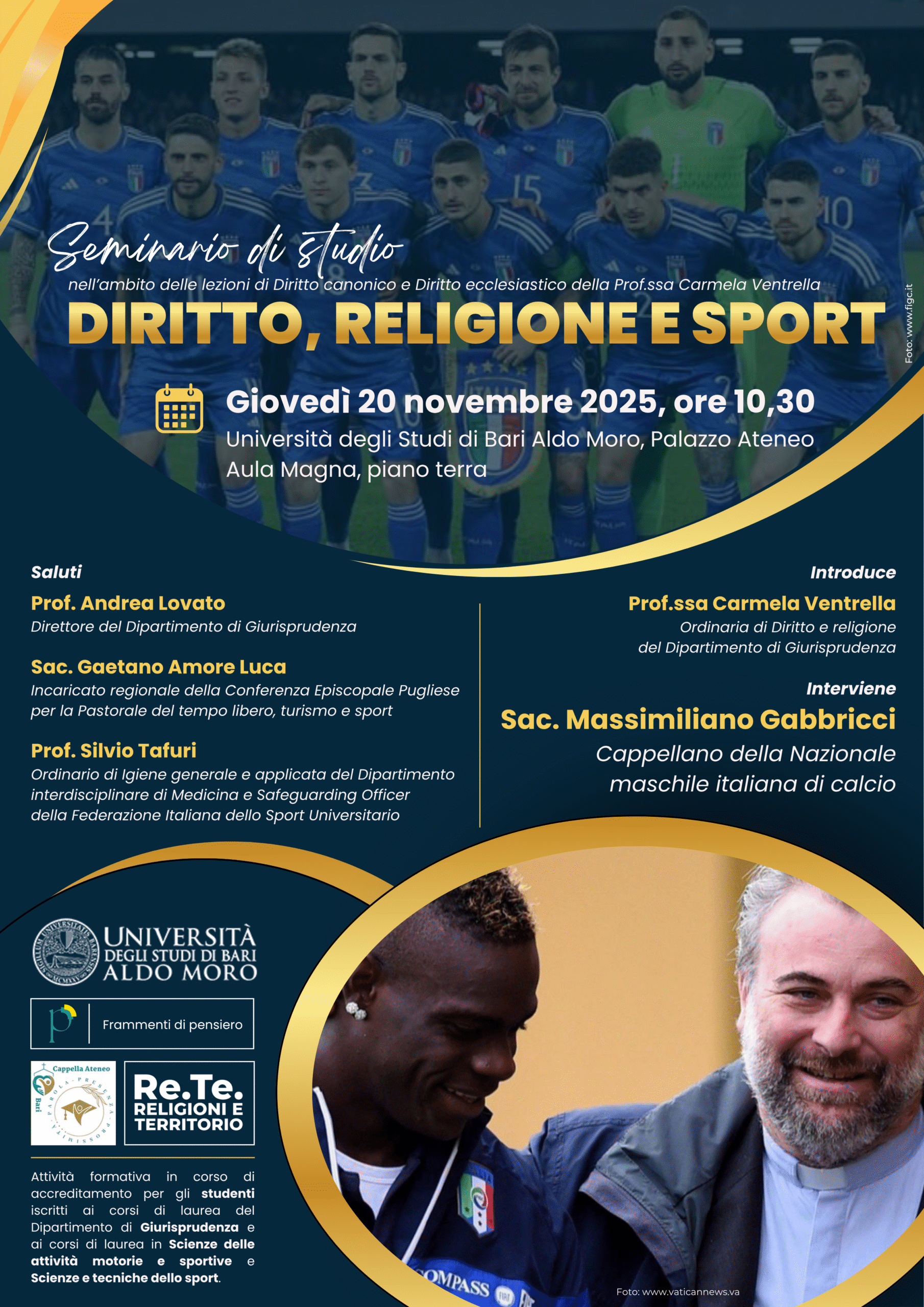 Giovedì 20 novembre 2025, alle ore 10,30, presso l’Aula Magna dell’Università degli Studi di Bari Aldo Moro (Palazzo Ateneo) si terrà il seminario di studio “Diritto, religione e sport“. Relazionerà sul tema del seminario il Sac. Massimiliano Gabbricci, Cappellano della Nazionale maschile italiana di calcio. L’iniziativa si inserisce nell’ambito delle lezioni dei corsi di Diritto canonico e Diritto ecclesiastico della Prof.ssa Carmela Ventrella che introdurrà il seminario. Parteciperanno, per i saluti istituzionali, il Prof. Andrea Lovato (Direttore del Dipartimento di Giurisprudenza), il Sac. Gaetano Amore Luca (Incaricato regionale della Conferenza Episcopale Pugliese per la Pastorale del tempo libero, turismo e sport), il Prof. Silvio Tafuri (Ordinario di Igiene generale e applicata del Dipartimento interdisciplinare di Medicina e Safeguarding Officer della Federazione Italiana dello Sport Universitario). L’attività formativa è in corso di accreditamento per gli studenti iscritti ai corsi di laurea del Dipartimento di Giurisprudenza e ai corsi di laurea in Scienze delle attività motorie sportive e Scienze e tecniche dello sport.